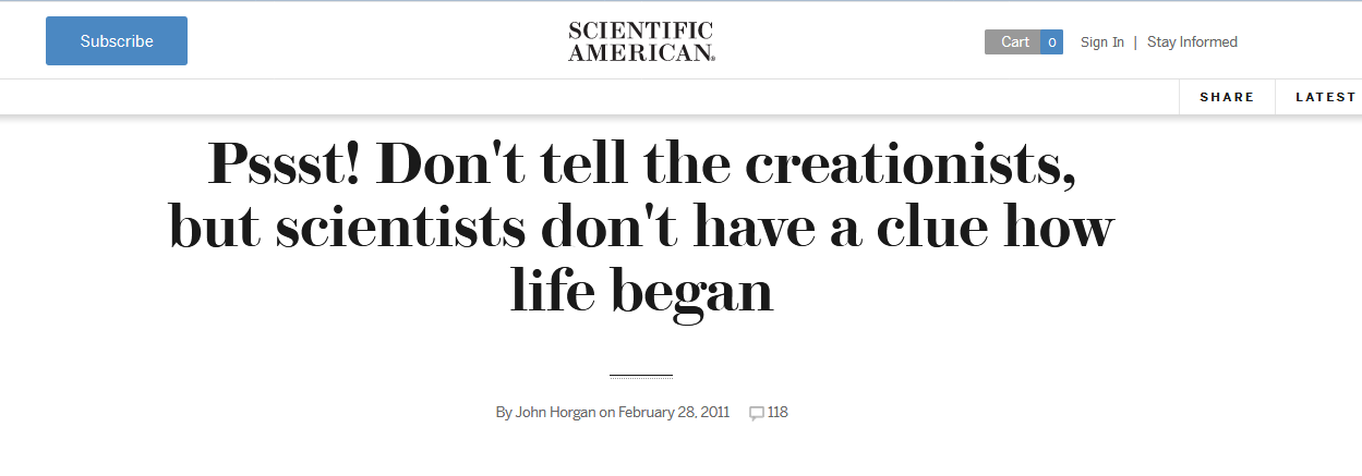 وعلى موقع الساينتيفك أمريكان العلمي العالمي، وتحت مقال بعنوان: "بسست!!! لا تخبر المؤمنين بالخَلْق الإلهي المباشر أن العلماء الماديين ليس لديهم أدنى فكرة عن كيف نشأت الحياة على الأرض.