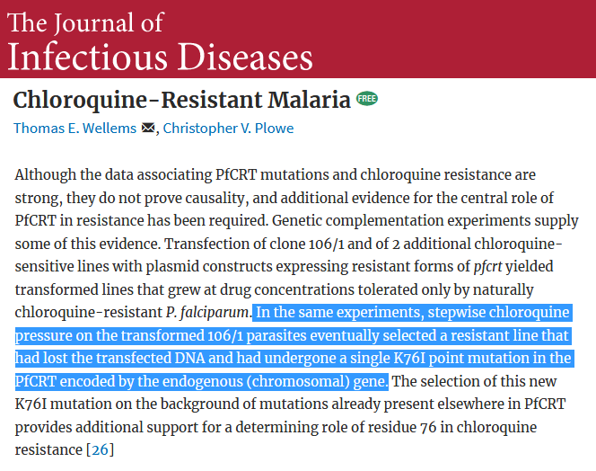 وأشهر مثال على ذلك طُفَيل المالاريا حين قاوم عقار الكُلوروكوين، وبعد أن توقف الأطباء عن وصف هذا العقار اختفت السلالات الضعيفة من طفيل المالاريا التي فقدت جزءًا من الشريط الجيني الخاص بها، وعادت السلالات الأصلية للظهور مجددًا.