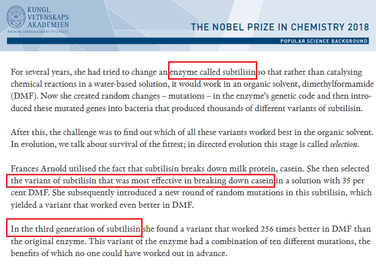 وهذا كلام الموقع الرسمي لنوبل: "إنزيم السبتليزين subtilisin ظلَّ كما هو في الجيل الأول والجيل الثاني والجيل الثالث نفس الإنزيم، داخل نفس الميكروب، داخل نفس النوع، داخل نفس العائلة، لكن فقط مجرد متغيرات ضمن إطار الإنزيم نفسه.