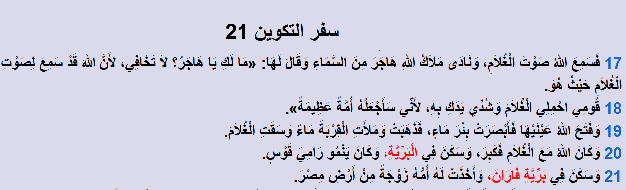 وَسَكَنَ فِي بَرِّيَّةِ فَارَانَ، وَأَخَذَتْ لَهُ أُمُّهُ زَوْجَةً مِنْ أَرْضِ مِصْرَ.