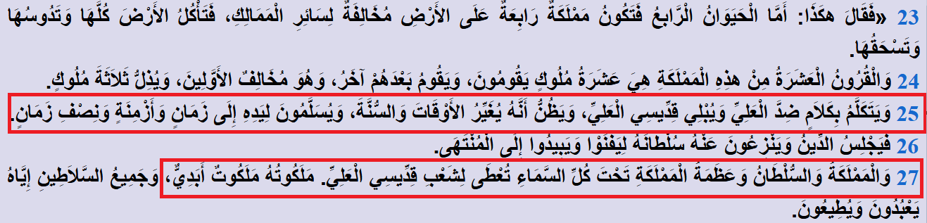 وبعد هذه الممالك الأربع سيظهر قِدِّيسُو الْعَلِيِّ الذين سيَأْخُذُونَ الْمَمْلَكَةَ، وَيَمْتَلِكُونَ الْمَمْلَكَةَ إِلَى الأَبَدِ وَإِلَى أَبَدِ الآبِدِينَ: سيكون فيهم الحُكم والتشريع من قِبَل الله إلى قيام الساعة... سيكونون أُمَّةً مجاهدةً!