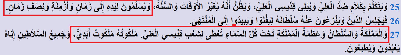 وَيُسَلَّمُونَ لِيَدِهِ إِلَى زَمَانٍ وَأَزْمِنَةٍ وَنِصْفِ زَمَان: سيبقى طُغيان إمبراطوريته في الأرض ثلاثة قرون ونصف القرن.