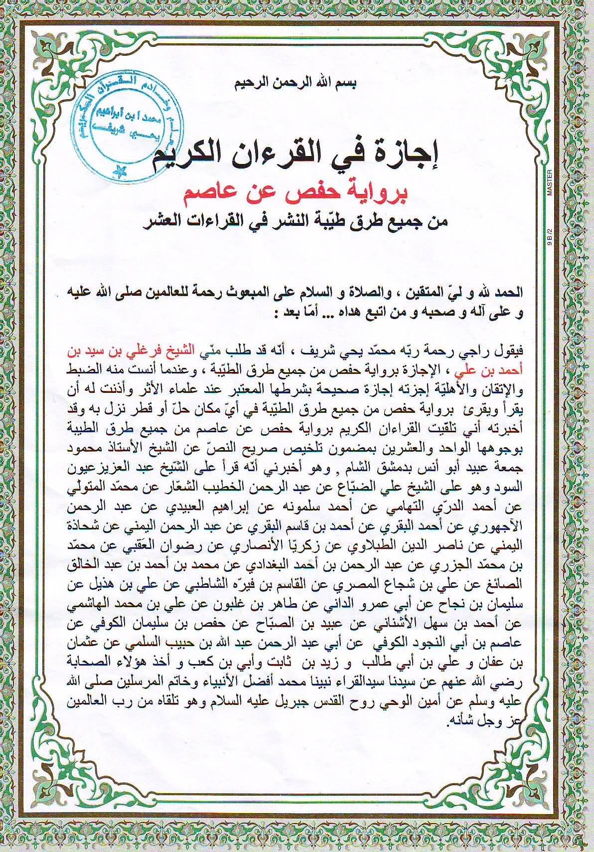 وهي مثالٌ من مئات الآلاف من الأمثلة على الإجازات التي ينقُلُ فيها الشيخُ القرآنَ عن شيخه عن شيخه صعودًا إلى الصحابة ثم النبي صلى الله عليه وسلم .