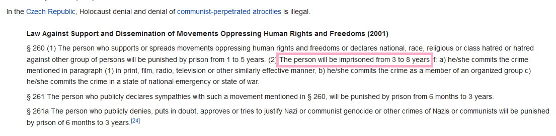 وفي التشيك يتمُّ السجن لمدة ثماني سنوات لمن يجري هذا البحث التاريخي.
