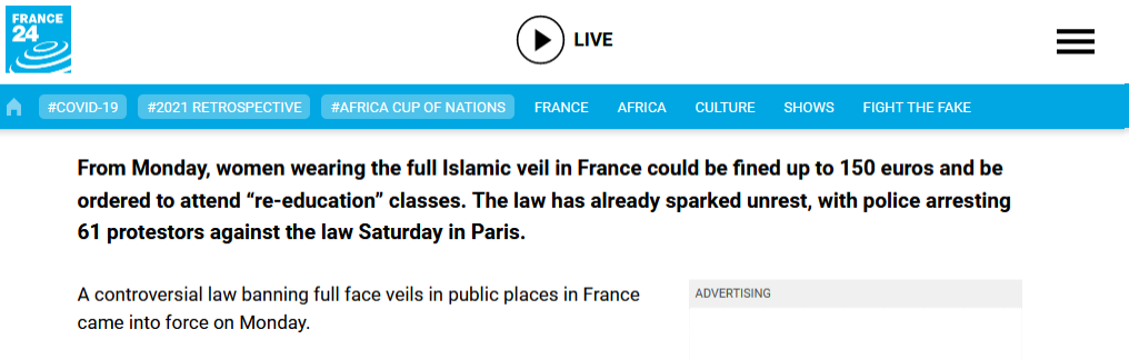 وهناك عقوبات في بعض الدول العلمانية مثل فرنسا لمجرد ارتداء حجاب؛ لأن الحجاب بنظرهم يمثل تهديدًا للقيم العلمانية.