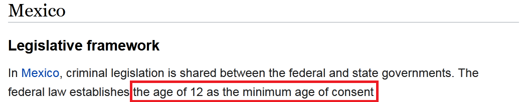 فعندما تبلغ الفتاة اثنتي عشرة سنة يحقُّ لها قانونيًّا الزواج، ويحق لها قانونيًّا ممارسة الزنا، كما في المكسيك.