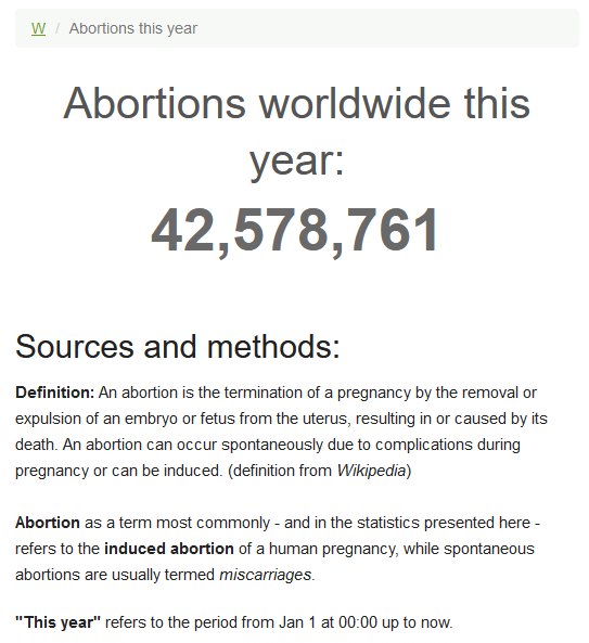 وطبقًا للموقع الإحصائي الشهير Worldometer فإنَّ أعداد الأجنة التي قُتلت عمدًا هذا العام وحده حتى وقت كتابة هذا الجزء من الكتاب يزيد على 42 مليون قتيل[1].