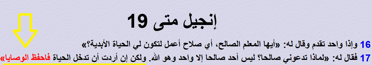 والمسيح عليه السلام حين سُئل ماذا يفعل الإنسان حتى يدخل الجنة؟ فأجاب: يجب أن تحفظ الوصايا العشر وتُنفذها.