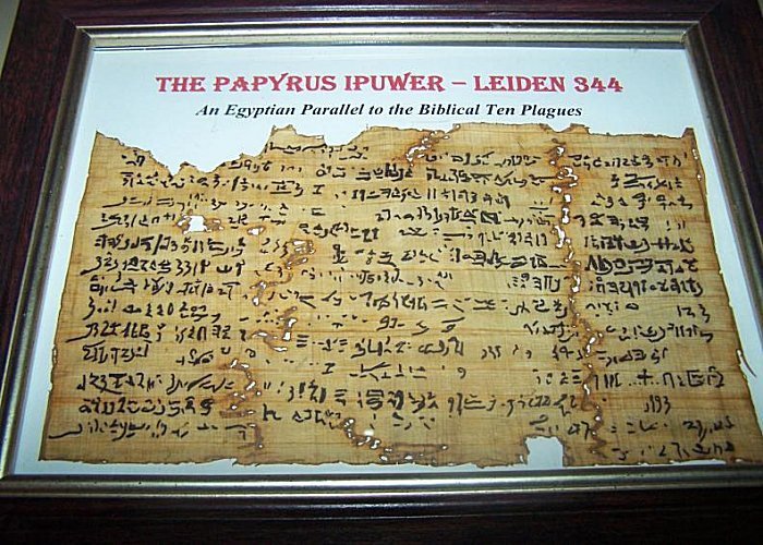 فمن المعلوم أن قوم فرعون أُصيبوا بالبلاءات: كالطوفان والجراد والقُمل والضفادع والدم قبل خروج بني إسرائيل مباشرةً، وبالفعل ورد هذا الأمر بالتفصيل في بردية أيْبِيور Ipuwer Papyrus والتي اكتُشفت وما زالت محفوظة حتى الساعة في متحف ليدن بهولندا.