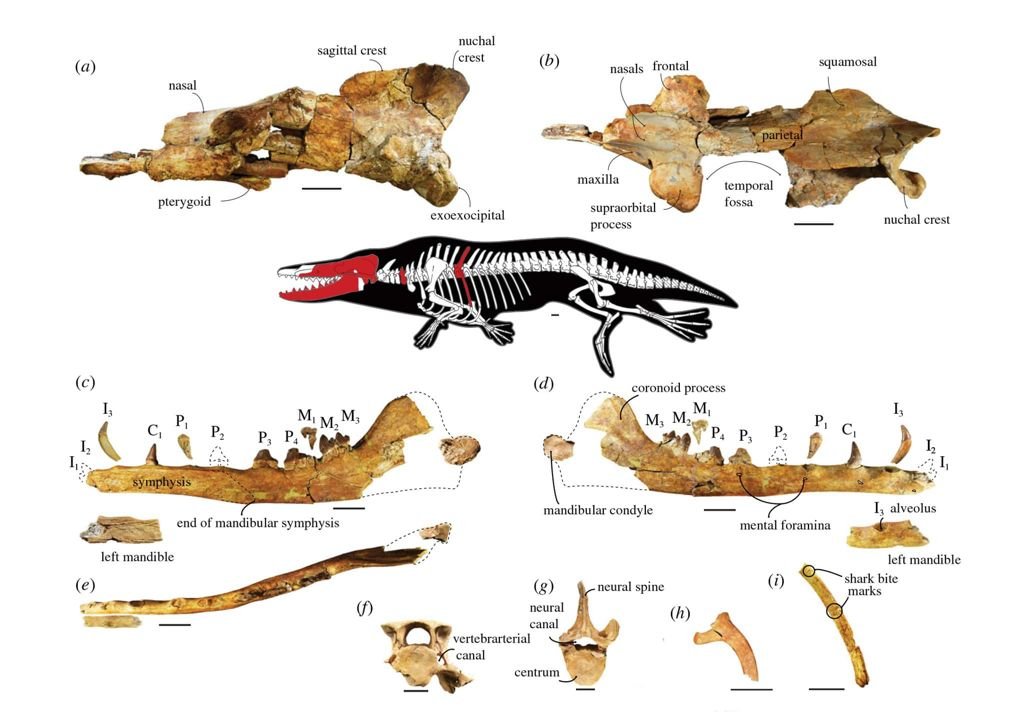 كل ما تم اكتشافه هو: الجمجمة وفقرتين وضلعين فقط.