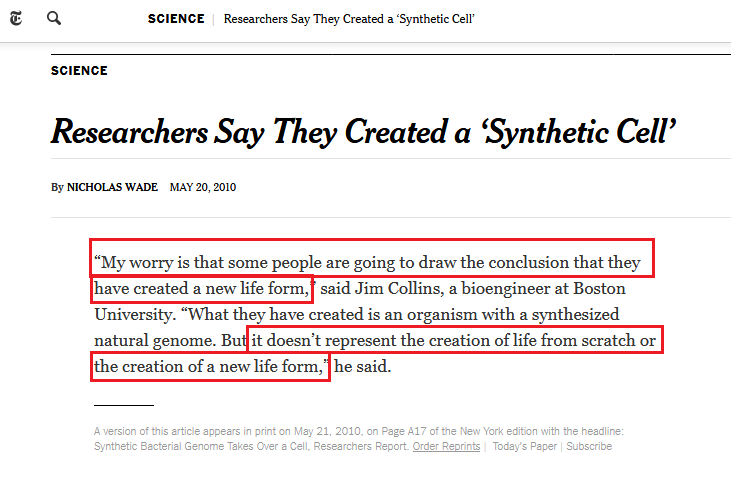 والأغرب مما سبق أن كريج فنتر بنفسه قال: "إننا لم نخلق حياة من الصفر We didn’t create life from scratch".