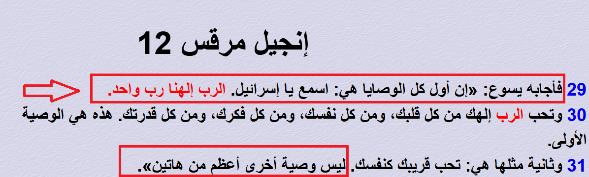 ويأتي النصُّ المدهش في إنجيل مرقس إصحاح 12: "اللَّهُ وَاحِدٌ وَلَيْسَ آخَرُ سِوَاهُ"[5].