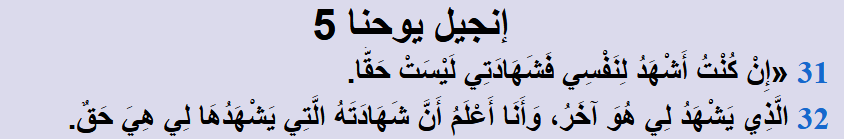 يقول المسيح عليه السلام : "إِنْ كُنْتُ أَشْهَدُ لِنَفْسِي فَشَهَادَتِي لَيْسَتْ حَقًّا. الَّذِي يَشْهَدُ لِي هُوَ آخَرُ وَأَنَا أَعْلَمُ أَنَّ شَهَادَتَهُ الَّتِي يَشْهَدُهَا لِي هِيَ حَقٌّ"[4].
