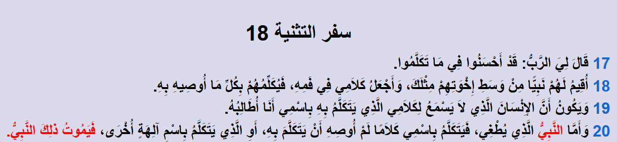 وعندما نعود لتكملة النص في سفر التثنية، يقول النصُّ: وَأَجْعَلُ كَلَامِي فِي فَمِهِ، فَيُكَلِّمُهُمْ بِكُلِّ مَا أُوصِيهِ بِهِ.