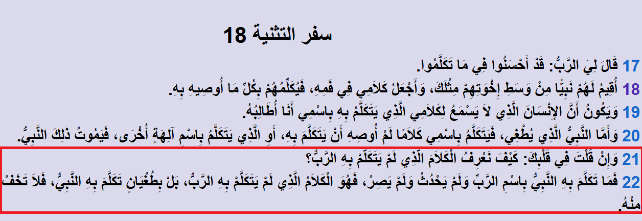 وَإِنْ قُلْتَ فِي قَلْبِكَ: كَيْفَ نَعْرِفُ الْكَلَامَ الَّذِي لَمْ يَتَكَلَّمْ بِهِ الرَّبُّ؟ فَمَا تَكَلَّمَ بِهِ النَّبِيُّ بِاسْمِ الرَّبِّ وَلَمْ يَحْدُثْ وَلَمْ يَصِرْ: تنبَّأ ونبوءته لم تتحقق.