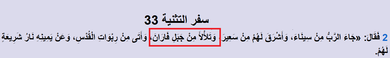 وَتَلأْلأَ مِنْ جَبَلِ فَارَانَ: جبل فاران هو المكان الذي سكنه إسماعيل عليه السلام ، وهذا ما تُقرره التوراة بنفسها،