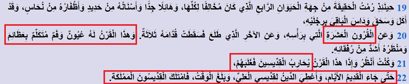 وبعد هذه الممالك الأربع سيظهر قِدِّيسُو الْعَلِيِّ الذين سيَأْخُذُونَ الْمَمْلَكَةَ، وَيَمْتَلِكُونَ الْمَمْلَكَةَ إِلَى الأَبَدِ وَإِلَى أَبَدِ الآبِدِينَ: سيكون فيهم الحُكم والتشريع من قِبَل الله إلى قيام الساعة... سيكونون أُمَّةً مجاهدةً!