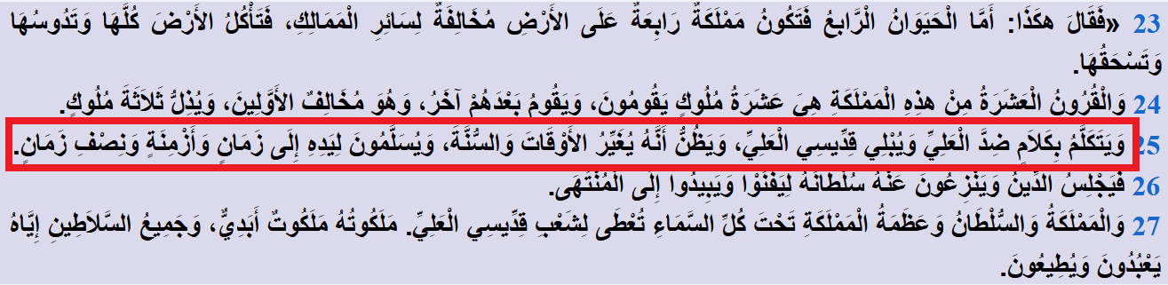 وَيُسَلَّمُونَ لِيَدِهِ إِلَى زَمَانٍ وَأَزْمِنَةٍ وَنِصْفِ زَمَان: سيبقى طُغيان إمبراطوريته في الأرض ثلاثة قرون ونصف القرن.