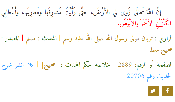 وأُعْطِيتُ الكَنْزَيْنِ الأحْمَرَ والأبْيَضَ: الكنز الأحمر هو الذهب، والكنز الأبيض هو الفضة.