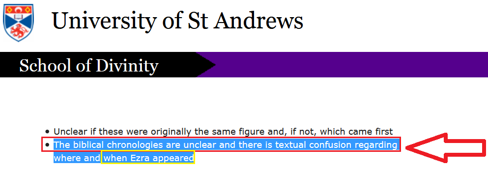 أما موقع جامعة القديس أندرو فيعترف أنَّ هذه مشكلة مُحيرة ومربكة... التسلسل الزمني لأحداث عزرا مُرْبِكٌ.