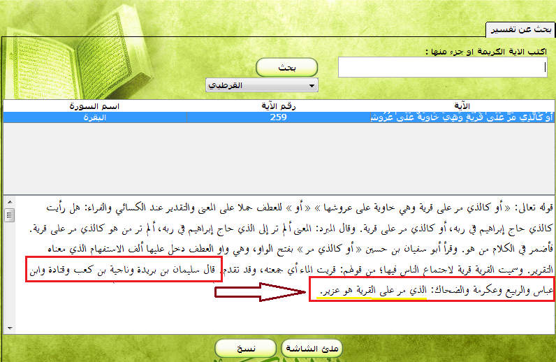 ورُبَّما جواب كل هذا الإشكال وهذه الورطة بأنَّ الشخص الذي أماته الله مائة عامٍ ثم بعثه في سورة البقرة هو عزرا عليه السلام ، وأنَّ القرية هي القُدس، وهذا قول كبار الصحابة وذهب إليه أئمة التفسير.