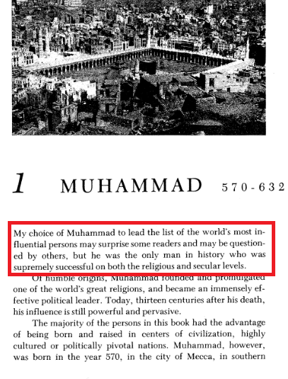 يقول مايكل هارْت الفيزيائي اليهودي: "اختياري لمحمد صلى الله عليه وسلم على رأس قائمة الأشخاص الأكثر تأثيرًا في العالم قد يفاجئ بعض القُرَّاء، ولكنه بالفعل أكثر شخصية مؤثرة في التاريخ".