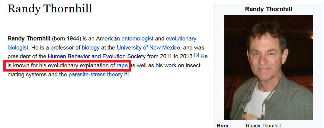 كَتَبَ أحد أكبر علماء النفس التطوُّريين ويُدعى: راندي ثورينهيل Randy Thornhill وهو يعمل رئيسًا لمجتمع السلوك والتطوُّر، ومتخصص في دراسة الاغتصاب من وجهة نظر إلحادية تطوُّرية.