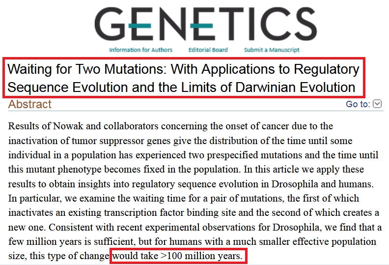 ففي بحث خطير نُشر في مجلة Genetics الدولية للدفاع عن نظرية التطوُّر، أثبت البحث أننا نحتاج لتثبيت طفرتين نافعتين في جيلٍ واحدٍ: نحتاج في الحشرات الصغيرة لزمن يصل إلى بضعة ملايين من السنين.