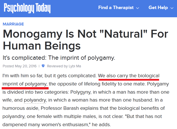 بل إنَّ البشر أنفُسَهم يحملون بصمة تعدُّد الزوجات بيولوجيًّا، ومسألة الزوجة الواحدة بالنسبة للإنسان هي أمر غير طبيعي بالمرة Unnatural، فالسؤال هنا: لماذا يتمُّ منع تعدد الزوجات في الغرب إذا كان الأمر كذلك؟