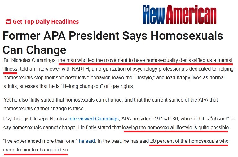 العجيب في الأمر أنَّ الرئيس السابق للرابطة الأمريكية للطب النفسي APA، والذي قاد عملية إزالة الشذوذ من دليل الاضطرابات العقلية سنة 1973 اعترف بعد أربعين سنةً أنَّ: الشذوذ الجنسي يمكن أن يُعالَج، فالمثلي من الممكن أن يعود إنسانًا طبيعيًّا.