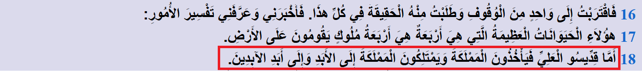 والنبي محمد بن عبد الله صلى الله عليه وسلم هو الذي رآه النبي دانيال في رؤياه، ورأى أنه سوف سيظهر بعد ظهور أربعة ممالك تحكم الأرض، وتحديدًا بعد ظهور قسطنطين الكبير بثلاثمائة وخمسين عامًا، وسوف تبقى شريعته إلى قيام الساعة، فهو خاتمُ الرسل.